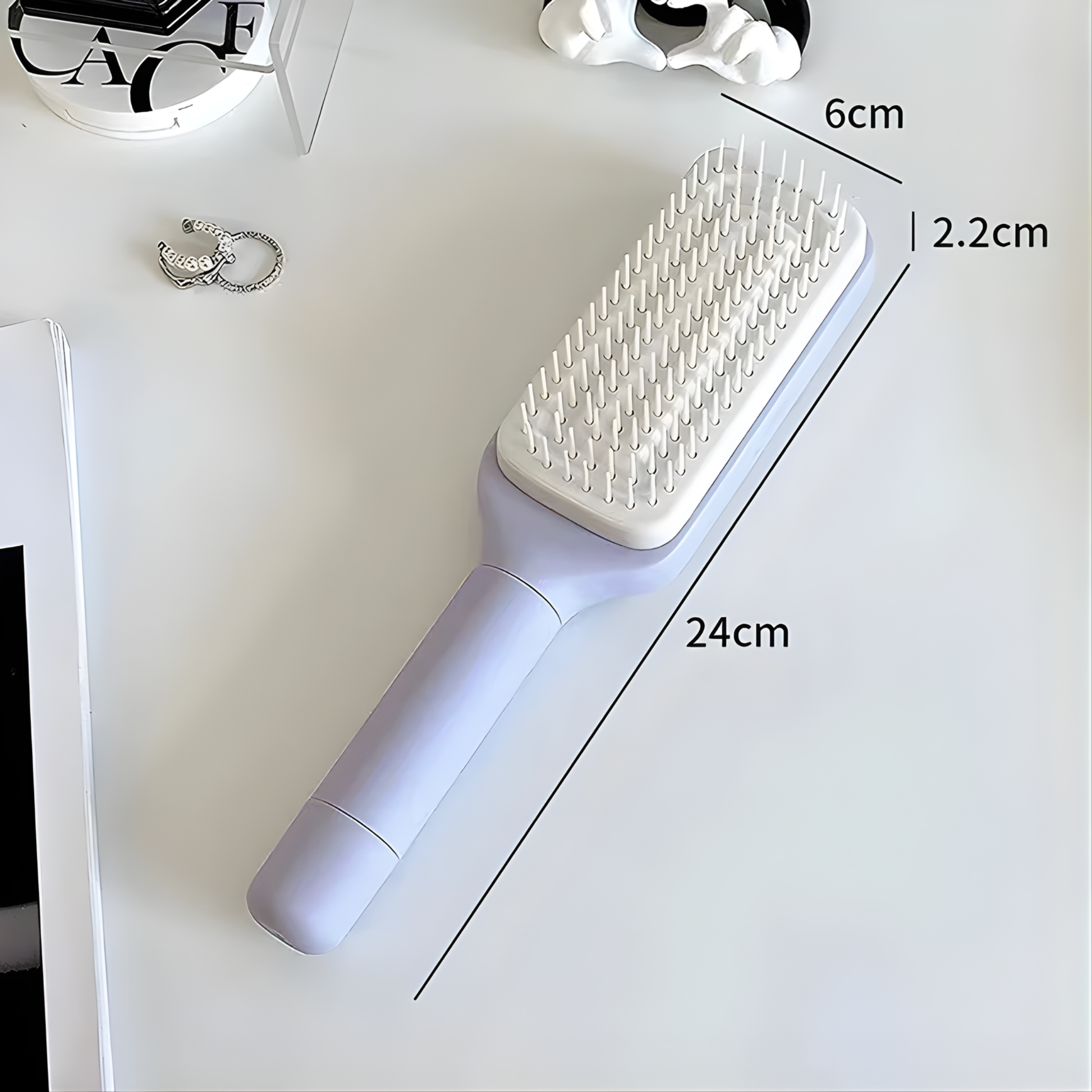 Cepillo con limpieza de una sola tecla 🖱️ que elimina el cabello acumulado al instante. Su bolsa de aire 🌬️ y cerdas redondeadas masajean el cuero cabelludo y peinan sin tirones.